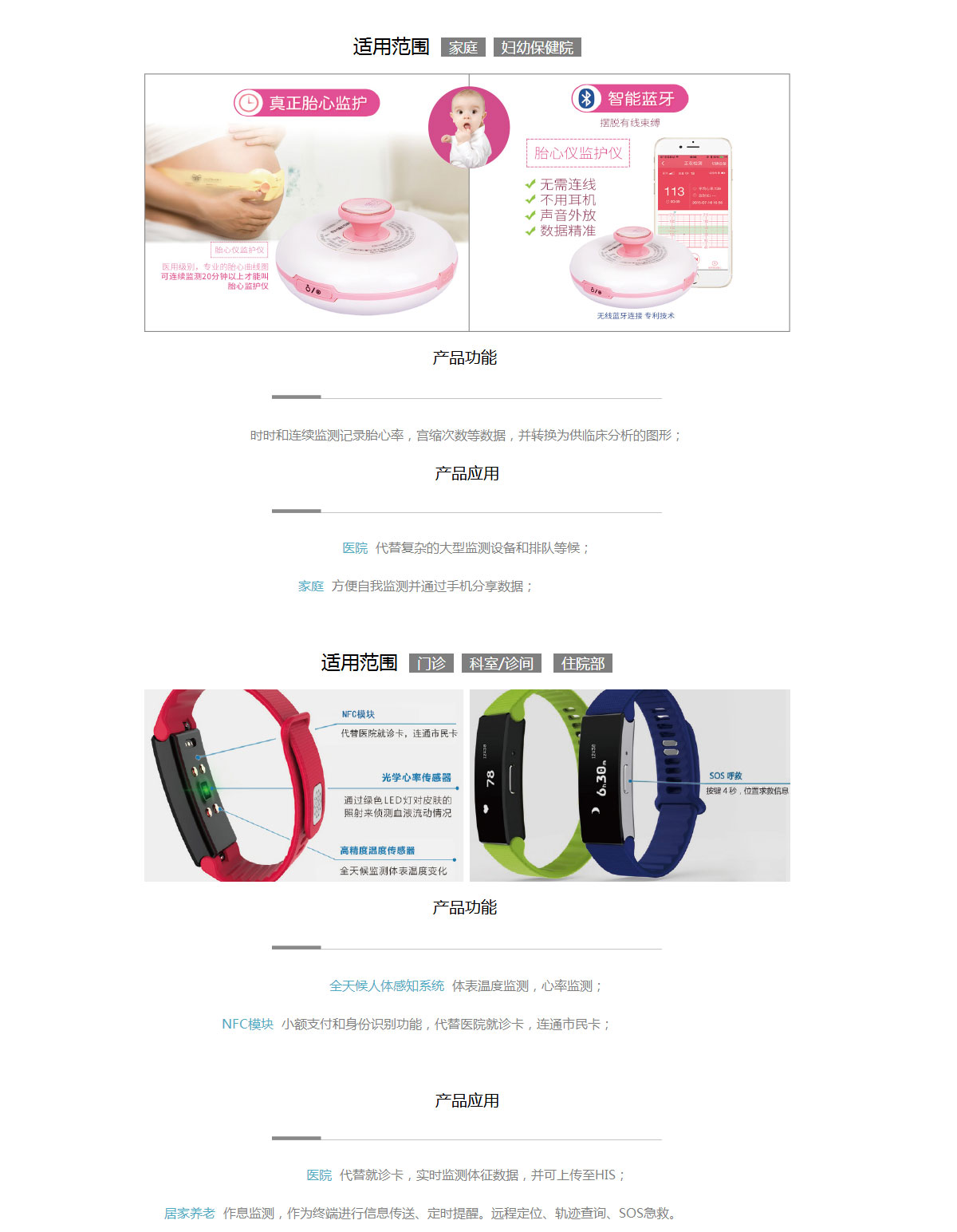 居家護(hù)理解決方案以醫(yī)療物聯(lián)網(wǎng)、智能穿戴設(shè)備、大數(shù)據(jù)等前沿技術(shù)為手段,通過健康一體機(jī)、健康手環(huán)、 胎心監(jiān)護(hù)儀等智能設(shè)備,為居家人員或養(yǎng)老服務(wù)機(jī)構(gòu)提供健康數(shù)據(jù)采集分析服務(wù)、慢病智能監(jiān)測(cè)服務(wù)以及 醫(yī)養(yǎng)增值服務(wù),同時(shí)結(jié)合醫(yī)院、支付機(jī)構(gòu)等優(yōu)質(zhì)資源,從而構(gòu)建一個(gè)完整的居家醫(yī)療 服務(wù)體系,實(shí)現(xiàn)居家健康,居家養(yǎng)老的優(yōu)質(zhì)生活